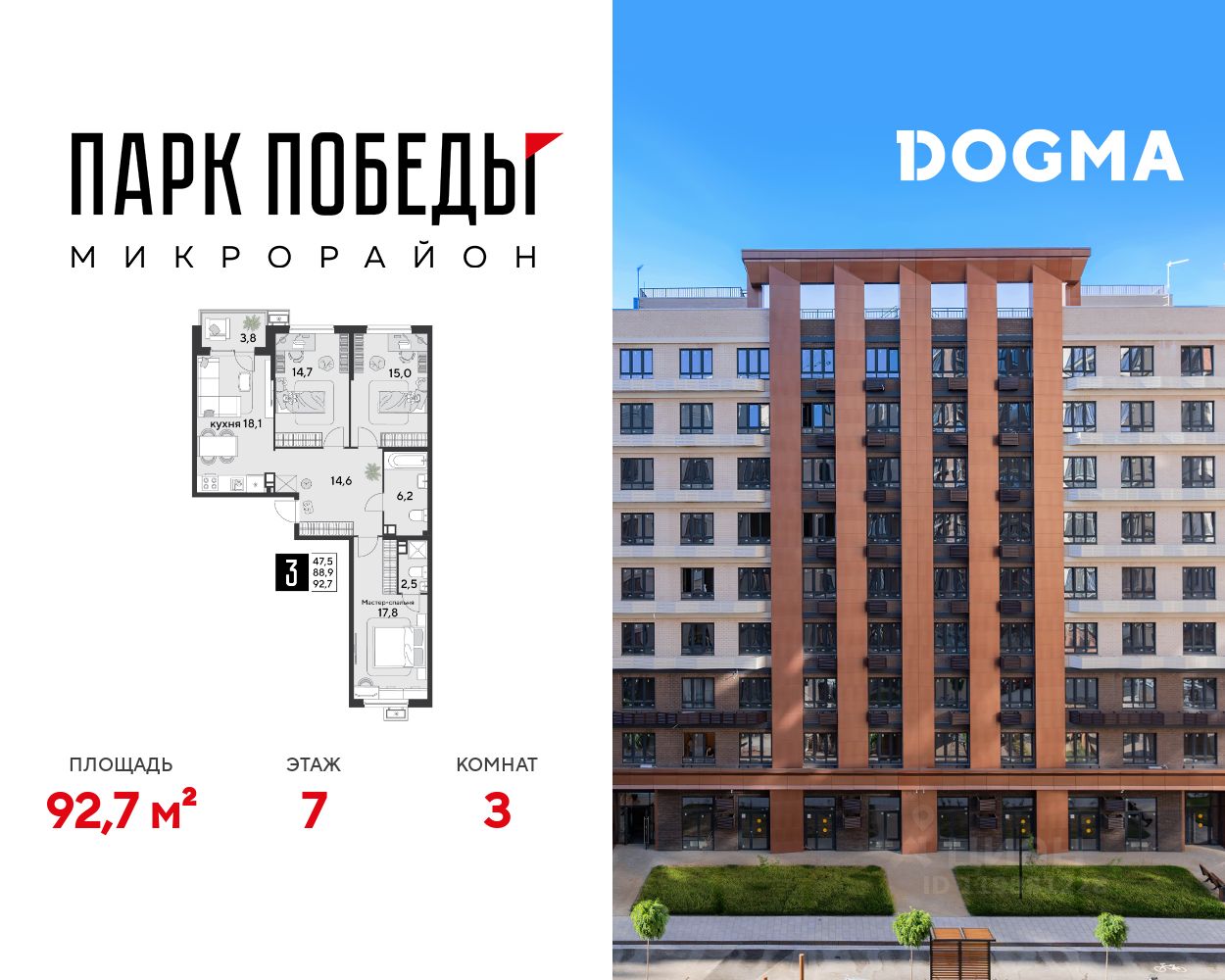Срок сдачи: 1 кв. 2026, общей площадью 92.7 кв.м., на 7 этаже.