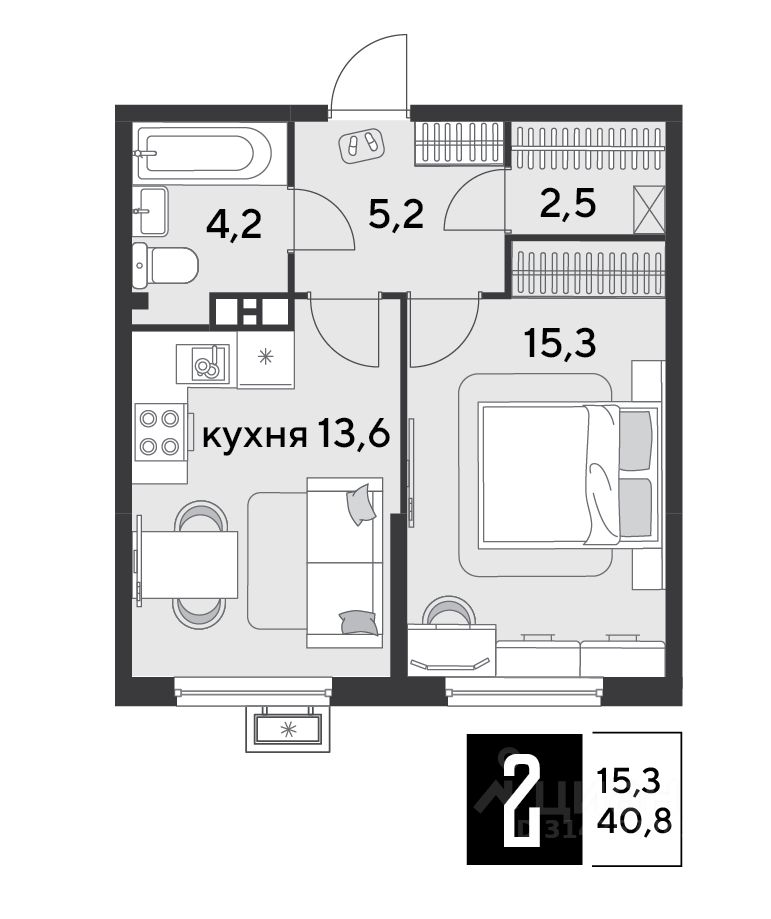 Срок сдачи: 4 кв. 2025, общей площадью 40.8 кв.м., на 5 этаже.