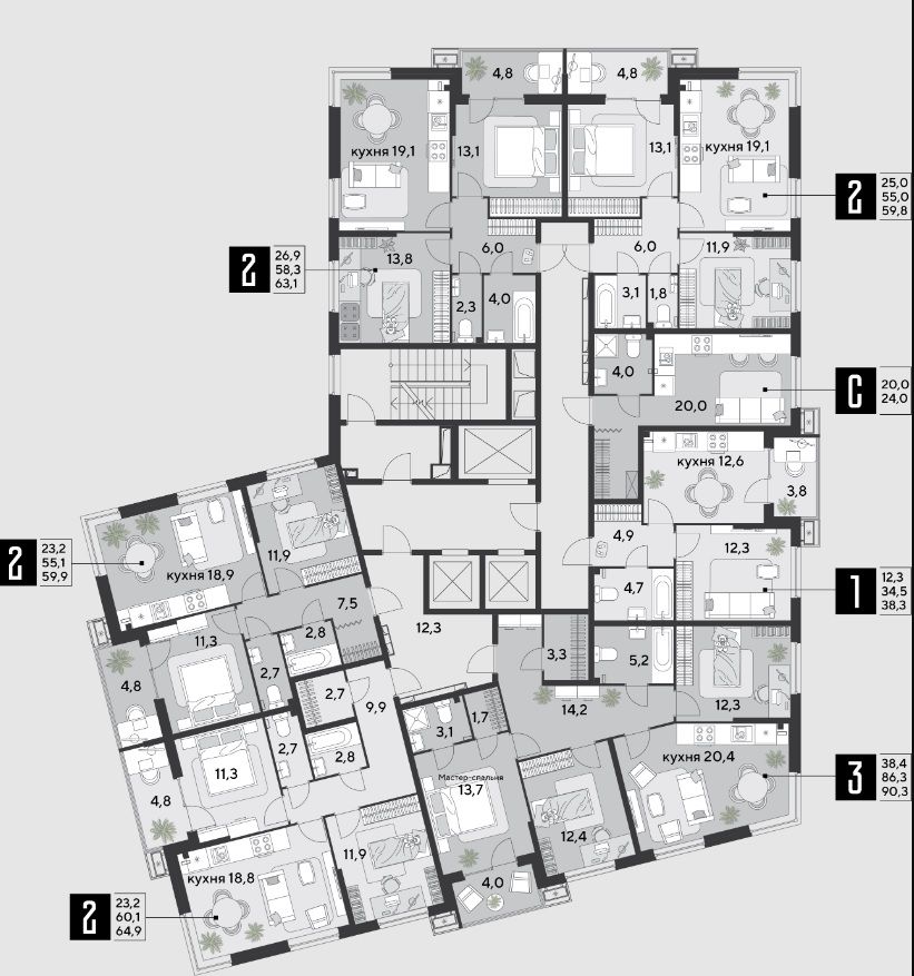 •Квартиры с мастер-спальнями и отдельными гардеробными