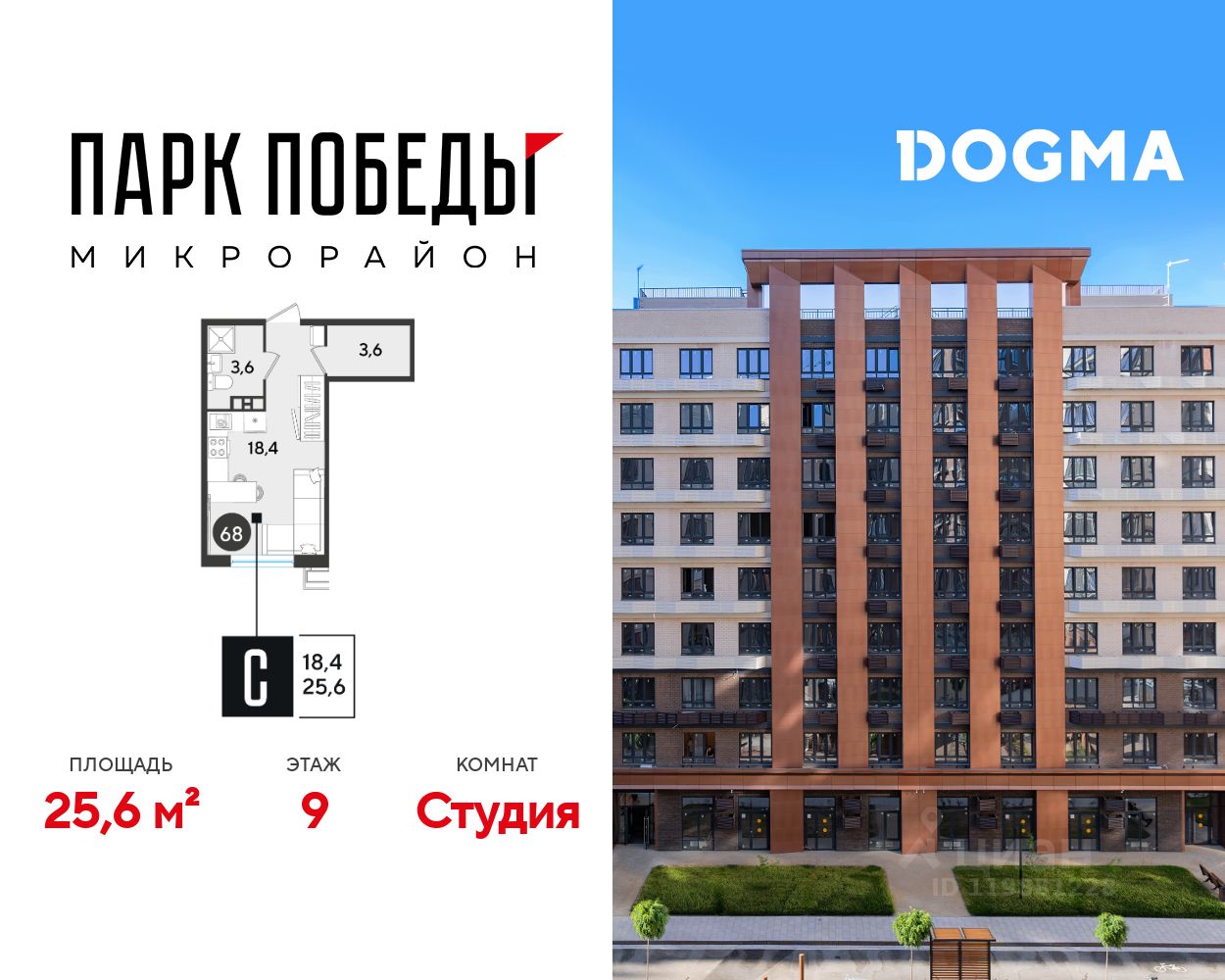 Срок сдачи: 2 кв. 2026, общей площадью 25.6 кв.м., на 9 этаже.