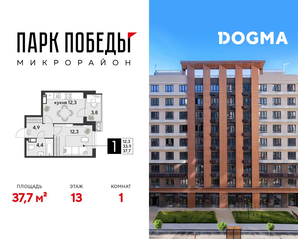 Срок сдачи: 2 кв. 2026, общей площадью 37.7 кв.м., на 13 этаже.