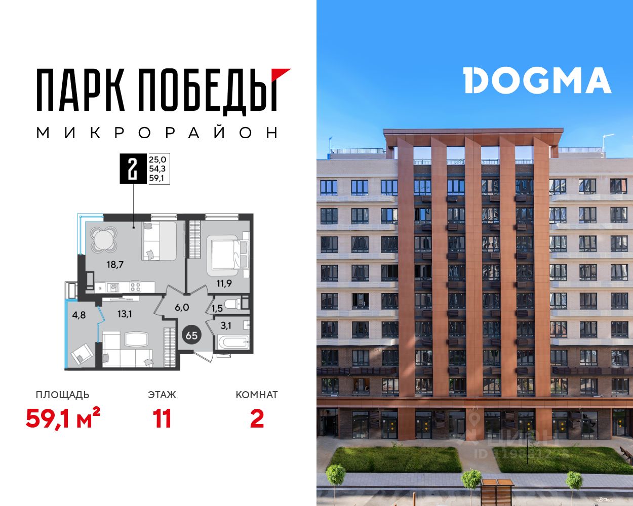 Срок сдачи: 2 кв. 2026, общей площадью 59.1 кв.м., на 11 этаже.