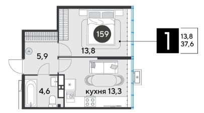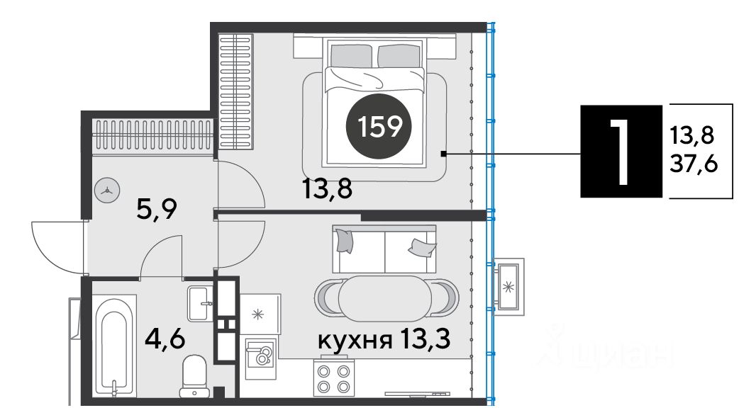Срок сдачи: 2 кв. 2026, общей площадью 37.6 кв.м., на 17 этаже.