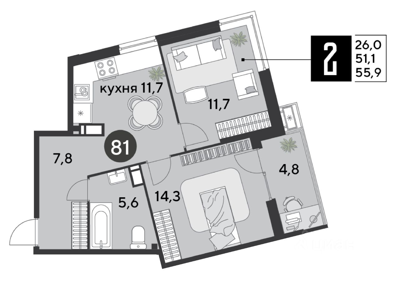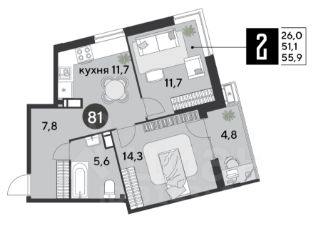 Срок сдачи: 2 кв. 2026, общей площадью 55.9 кв.м., на 10 этаже.