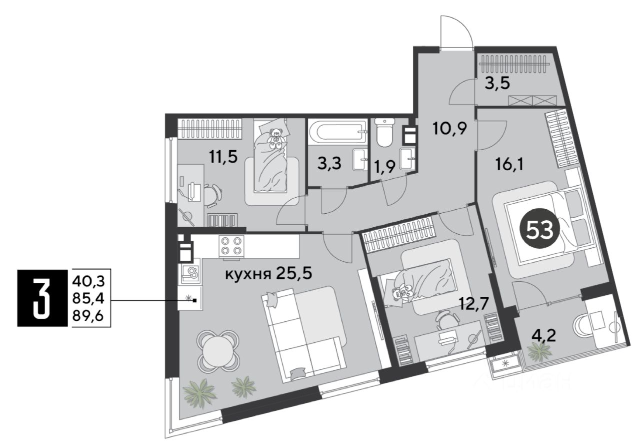 Срок сдачи: 2 кв. 2026, общей площадью 89.6 кв.м., на 7 этаже.