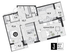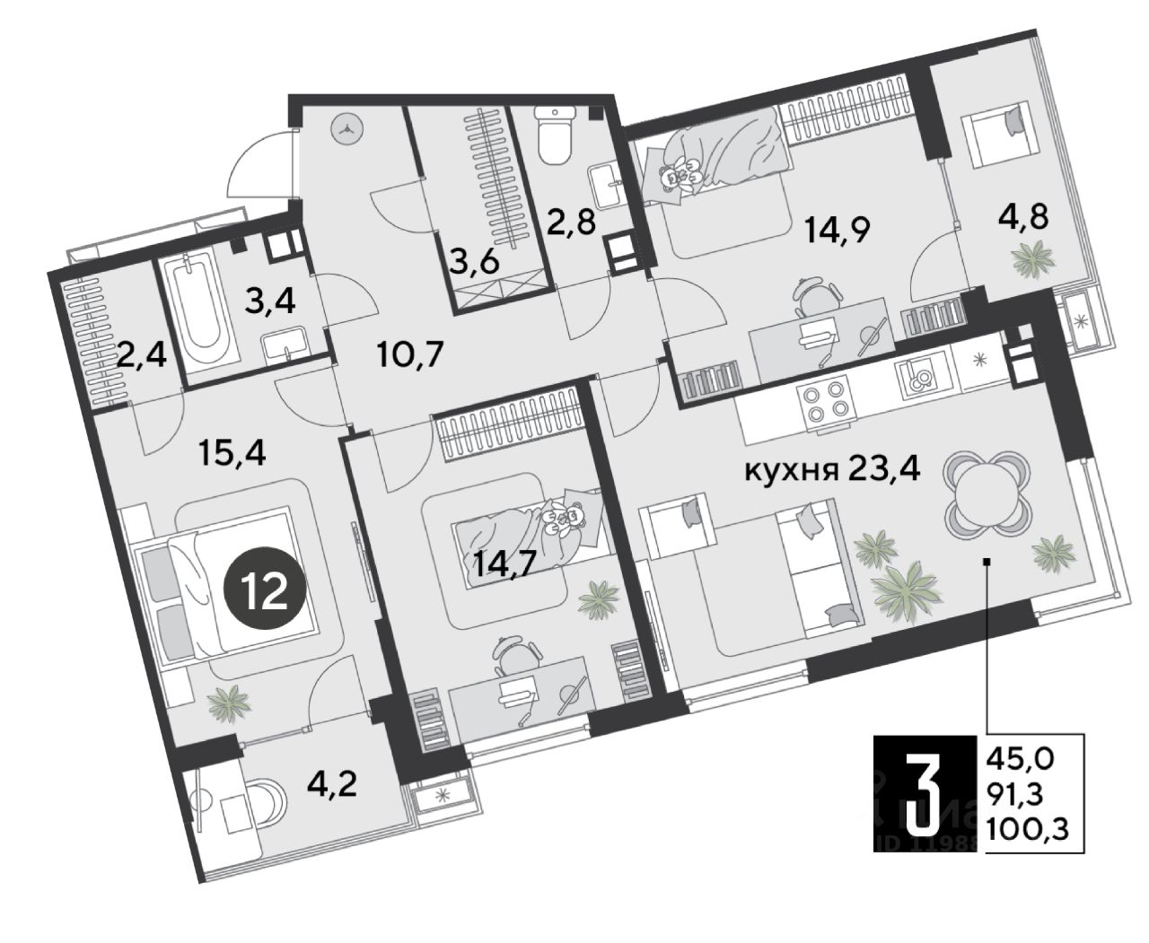 Срок сдачи: 2 кв. 2026, общей площадью 100.3 кв.м., на 3 этаже.
