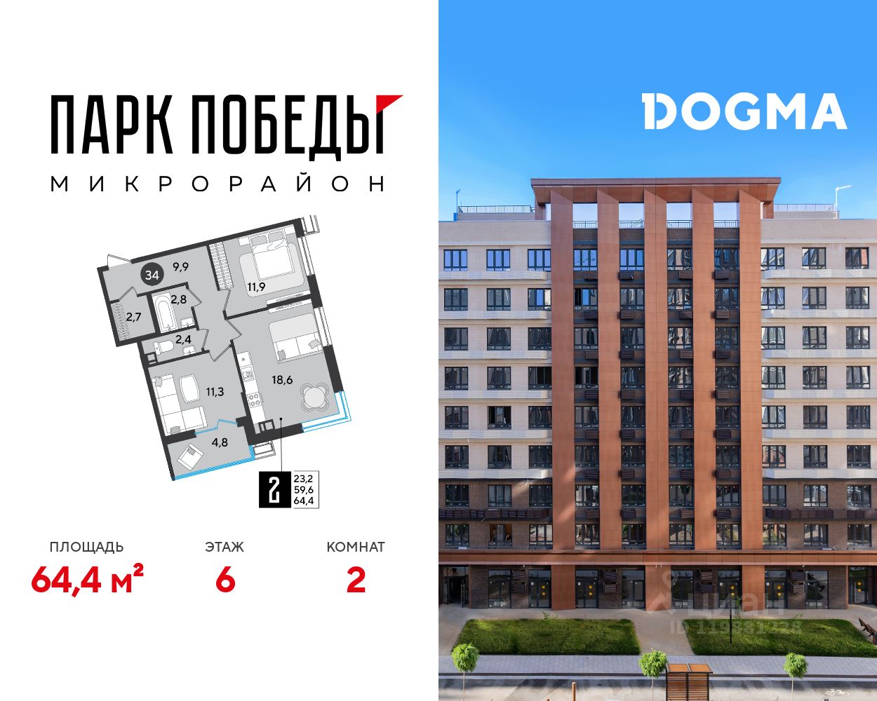 Срок сдачи: 2 кв. 2026, общей площадью 64.4 кв.м., на 6 этаже.