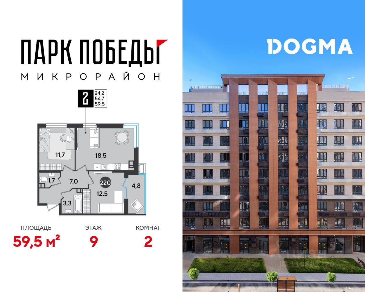 Срок сдачи: 2 кв. 2026, общей площадью 59.5 кв.м., на 9 этаже.