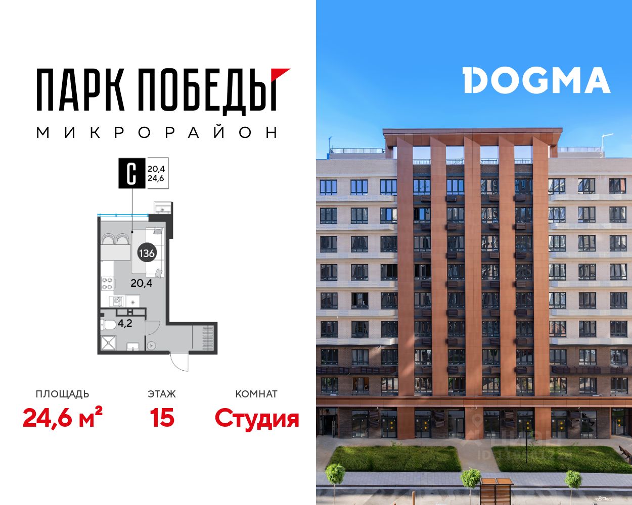 Срок сдачи: 2 кв. 2026, общей площадью 24.6 кв.м., на 15 этаже.