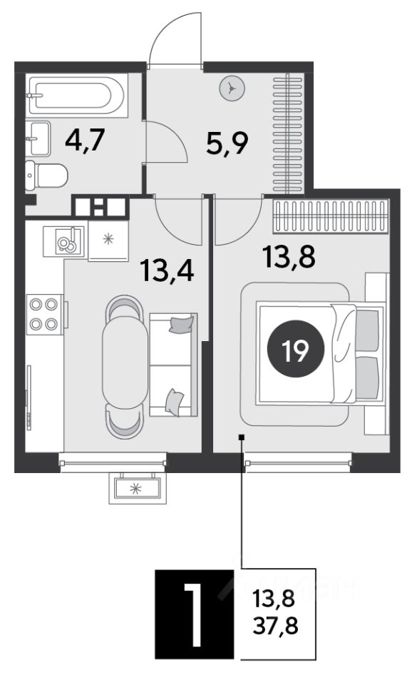 Срок сдачи: 2 кв. 2026, общей площадью 37.8 кв.м., на 3 этаже.