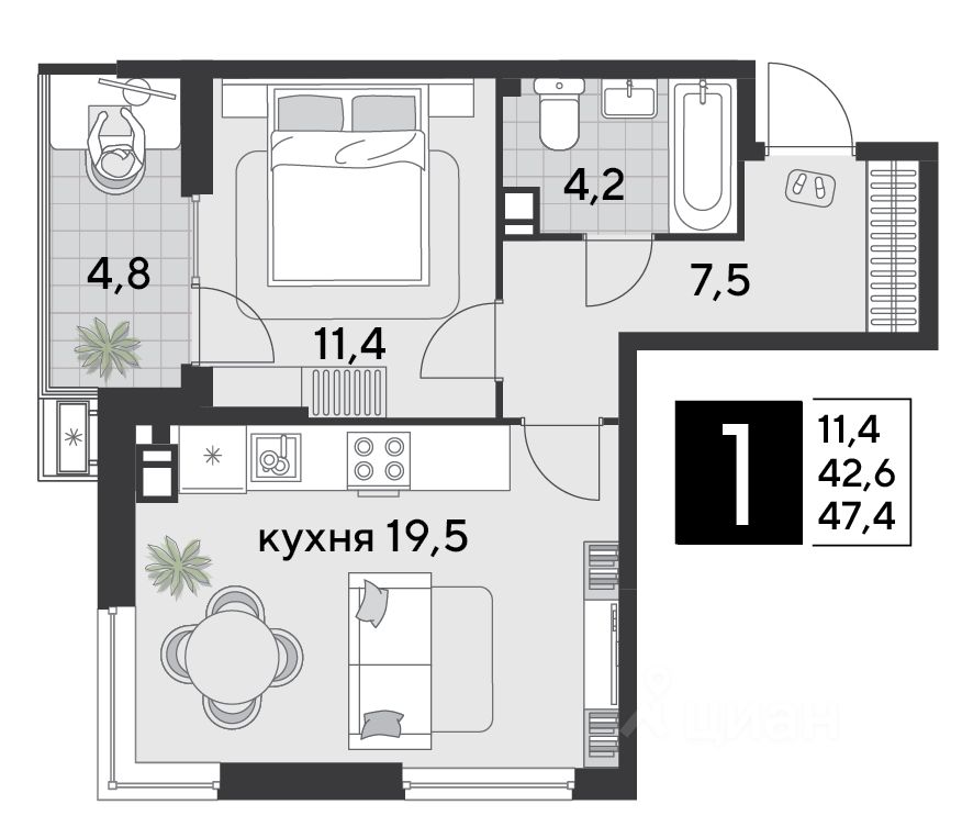 Срок сдачи: 4 кв. 2025, общей площадью 47.4 кв.м., на 3 этаже.