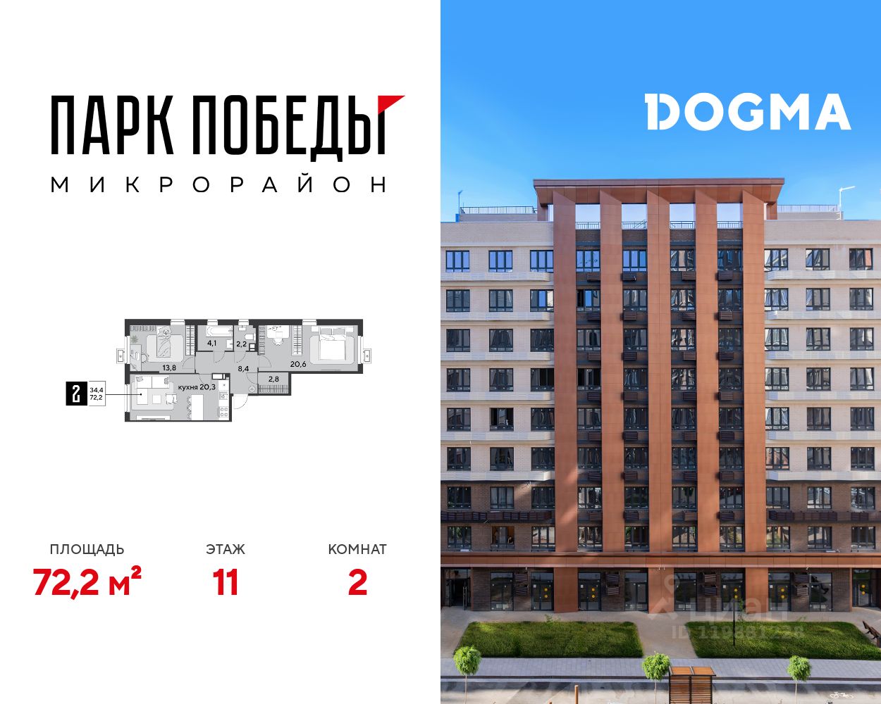 Срок сдачи: 4 кв. 2025, общей площадью 72.2 кв.м., на 11 этаже.