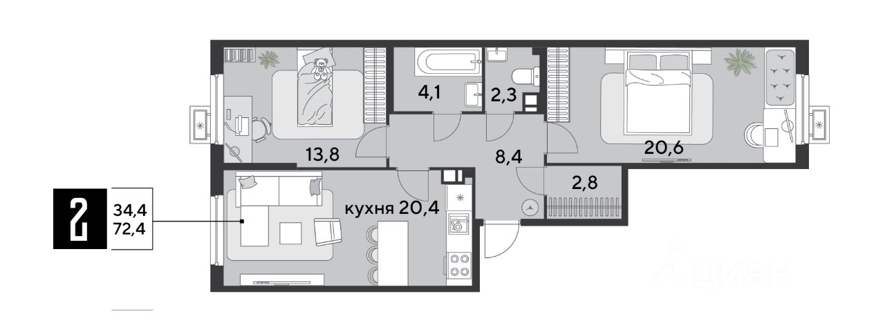 Срок сдачи: 4 кв. 2025, общей площадью 72.4 кв.м., на 9 этаже.