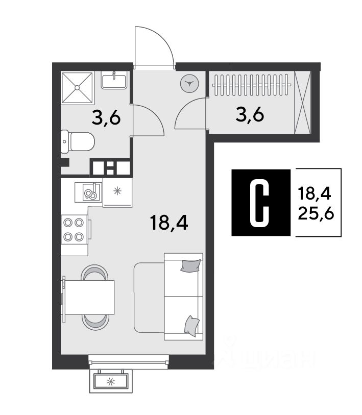 Срок сдачи: 2 кв. 2026, общей площадью 25.6 кв.м., на 9 этаже.
