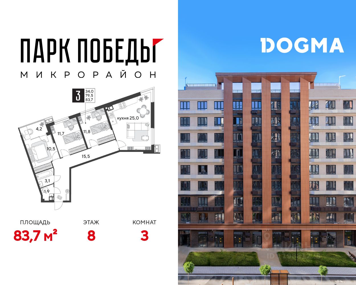 Срок сдачи: 1 кв. 2026, общей площадью 83.7 кв.м., на 8 этаже.