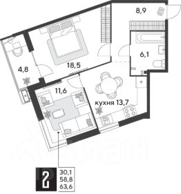 Срок сдачи: 4 кв. 2025, общей площадью 63.6 кв.м., на 2 этаже.
