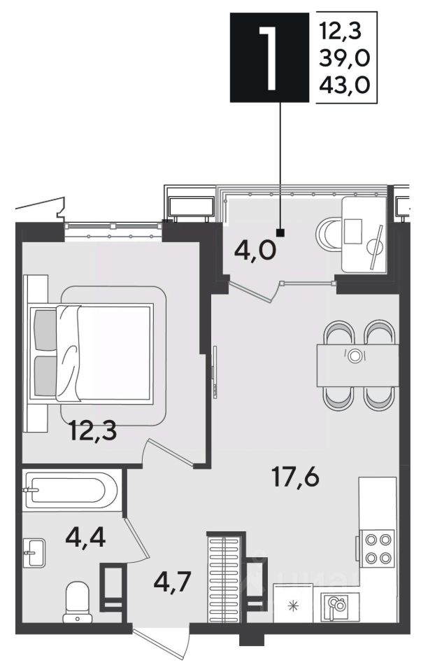 Срок сдачи: 4 кв. 2025, общей площадью 43 кв.м., на 18 этаже.