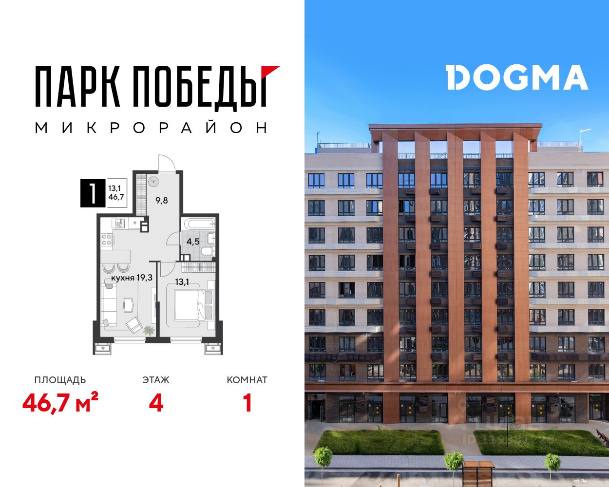 Срок сдачи: 1 кв. 2026, общей площадью 46.7 кв.м., на 4 этаже.