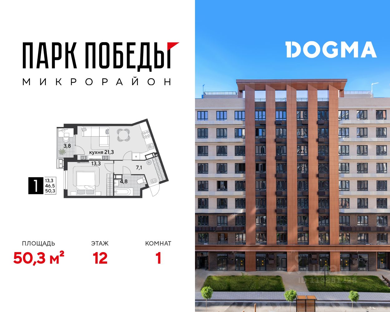 Срок сдачи: 1 кв. 2026, общей площадью 50.3 кв.м., на 12 этаже.