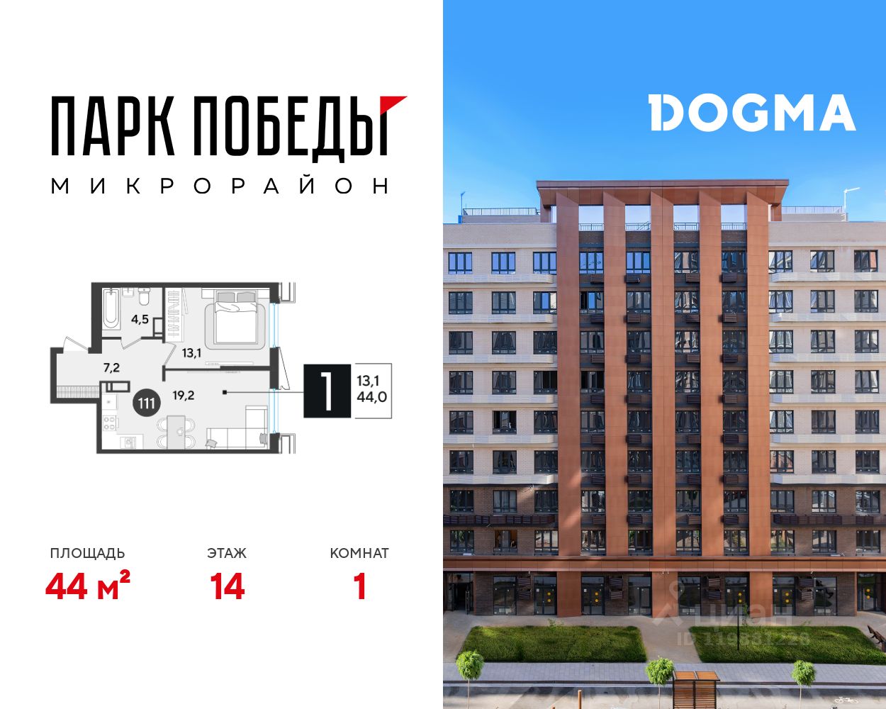Срок сдачи: 1 кв. 2026, общей площадью 44 кв.м., на 14 этаже.
