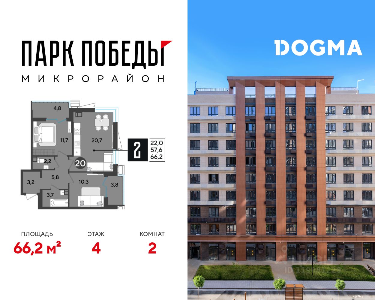 Срок сдачи: 4 кв. 2025, общей площадью 66.2 кв.м., на 4 этаже.