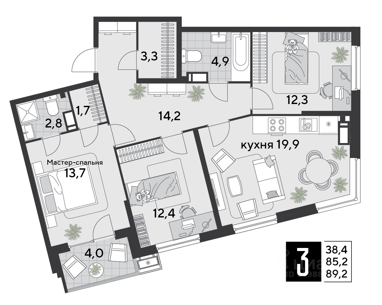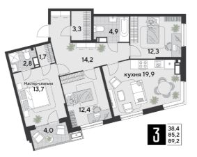 Срок сдачи: 2 кв. 2026, общей площадью 89.2 кв.м., на 14 этаже.