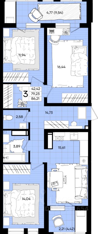 Высота потолков до 3,9 м наполняет пространство светом и воздухом, создавая ощущение свободы.