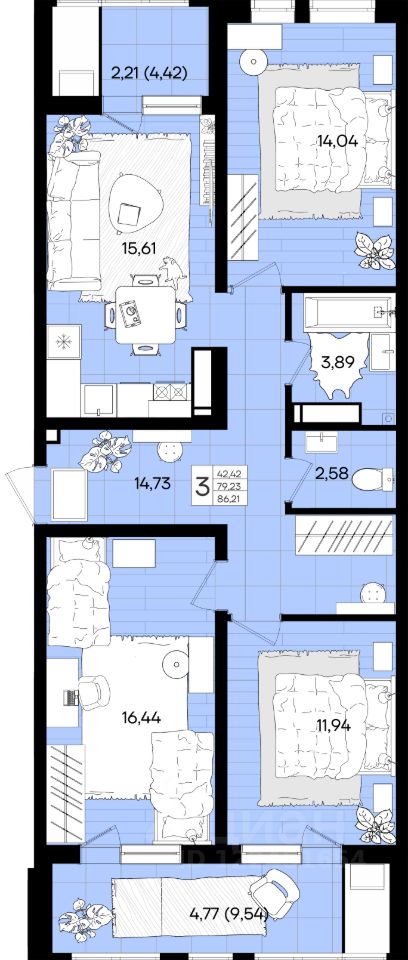 Высота потолков до 3,9 м наполняет пространство светом и воздухом, создавая ощущение свободы.
