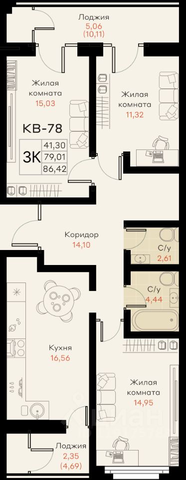 Высота потолков до 3,9 м наполняет пространство светом и воздухом, создавая ощущение свободы.