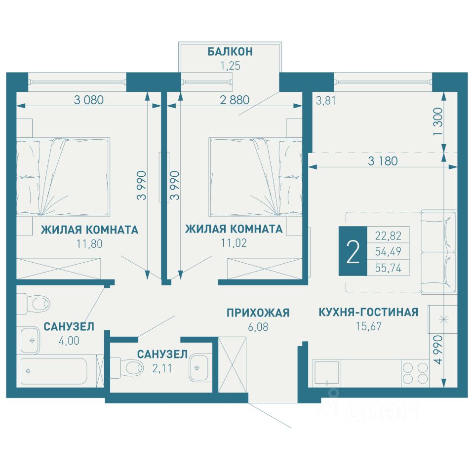 Продается 2 комнатная квартира площадью 55.74 кв. м. на 2 этаже 18 этажного дома, 1 подъезд, номер 14. Стоимость данного лота включает в себя ремонт, мебель и технику. Будут представлены 3 варианта обустройства квартиры: светлый, тонированный и авторский. Для более подробного ознакомления вы можете обратиться в отдел продаж. Жилой комплекс "ИНАЧЕ в Молодежном" включает в себя 14 домов комфорт+ класса переменной этажности с более чем 100 видами планировок, в том числе квартиры с террасами, двухуровневые квартиры и урбан виллы, детский сад на 350 мест, храм, 2 наземных паркинга, а также бульвар и прогулочные аллеи. Срок сдачи первой очереди 4 квартал 2026 года Жилой комплекс находится в Молодежном — тихом микрорайоне с атмосферой размеренной жизни. Рядом расположен зеленый сквер "Изумрудный" с зелеными деревьями и велодорожками.