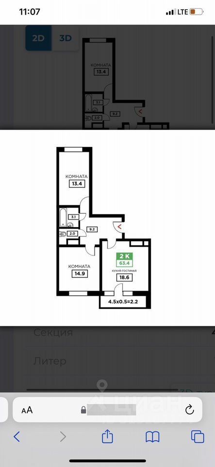 2-х Комнатная Квартира на 18 этаже, литер 1, подъезд 4. Площадь 67,8 кв. М.