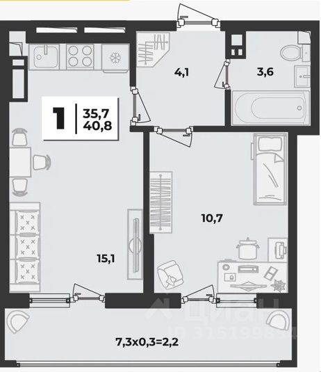 Прихожая 4,1 м2, кухня — 15,1 м2 и комната 10,7м2 с выходом ленточную на лоджию 2,2 м2 с панорамным остеклением, санузел совмещенный. Высота потолков — 2.7 метра, что придает помещению ощущение простора. Раздельный санузел, очень удобно для большой семьи.