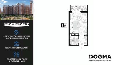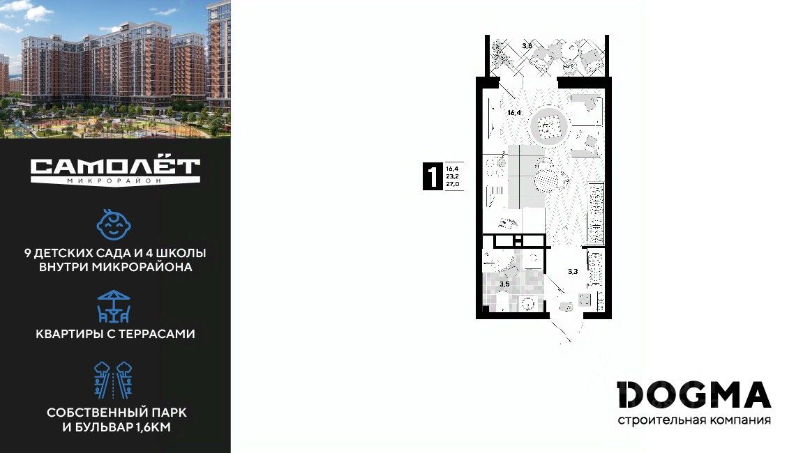 В продаже квартира-студия от застройщика! Мкр. "Самолет" 4 очередь, г. Краснодар, Литер 23 Срок сдачи: 2 кв. 2023, общей площадью 27 кв.м., на 14 этаже.