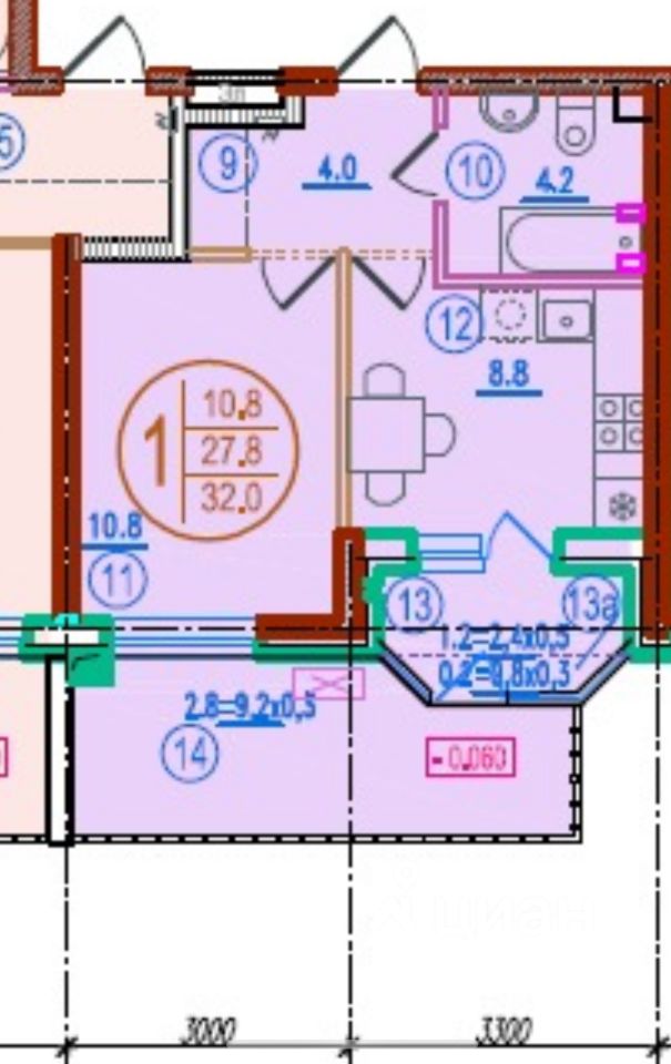 Общая площадь квартиры составляет 32 кв. м, жилая площадь — 10.8 кв. м, а кухня — 8.8 кв. м. Квартира расположена на первом этаже девятиэтажного дома, построенного в 2025 году.