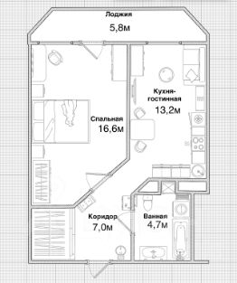 Комнаты: кухня-гостиная -13,2 кв.м., спальная-16,6 кв.м., коридор-7,0 кв.м , ванная 4,7 кв.м., лоджия- 5,8 кв.м.