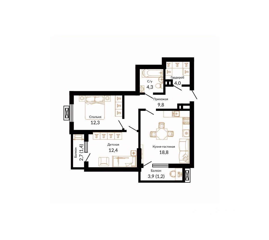 Общая площадь64,4 м²
