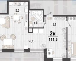 Совершенно необыкновенная планировка не оставит равнодушных даже самых требовательных покупателей. Любой дизайнер в данном пространстве создаст шедевр, который будет радовать не только глаз, но и душу. Из прихожей 6,8 м2 мы попадаем в гостиную 50 м2 с выходом на открытую террасу 20 м2 (дополнительное пространство релаксации), прямо кухня 13,3 м2, далее справа роскошная спальня 31,2 м. Два санузла. Высота потолков составляет 2.7 метра, что добавляет ощущение простора и свободы.