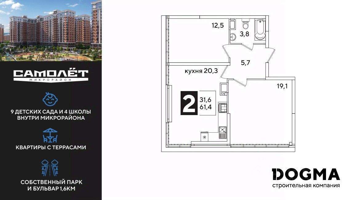 DOGMA - ТОП-3 застройщик по объему строительства в РФ. "САМОЛЁТ" — концептуальный жилой микрорайон, который расположен на северо-западе Краснодара, в районе Западного Обхода. Квартал спроектирован как "город в городе", поэтому здесь будет всё для комфортной жизни: современные дома с разными планировками, дороги, школы и детские сады, поликлиника, торговые центры, парки и аллеи. Микрорайон находится далеко от промышленных предприятий, сочетает удобство городской жизни и экологически благоприятную среду. Инфраструктура нового микрорайона: • 4 школы и 9 детских садов на территории микрорайона • Функциональные планировки • Собственный бульвар протяжённостью 1,6км • Светомузыкальный фонтан протяжённостью 55 метров • Амфитеатр • Парк 7 ГА • Скейт-парк • Детская аква-площадка • Круглосуточное видеонаблюдение и пост охраны Приобрести квартиру можно одним из способов: ипотека, рассрочка, наличный расчет.