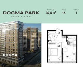 В продаже 1-комнатная квартира от застройщика! Мкр. "DOGMA PARK" г. Краснодар, Литер 16 Срок сдачи: 4 кв. 2027, общей площадью 37.4 кв.м., на 16 этаже.