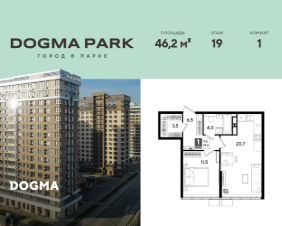 В продаже 1-комнатная квартира от застройщика! Мкр. "DOGMA PARK" г. Краснодар, Литер 14 Срок сдачи: 4 кв. 2027, общей площадью 46.2 кв.м., на 19 этаже.
