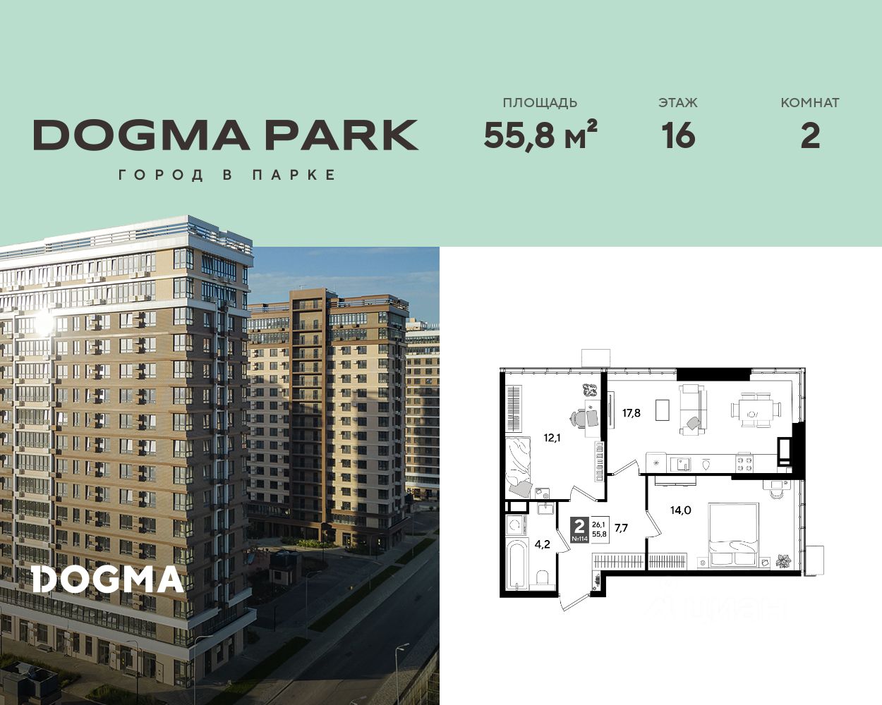 В продаже 2-комнатная квартира от застройщика! Мкр. "DOGMA PARK" г. Краснодар, Литер 18 Срок сдачи: 4 кв. 2027, общей площадью 55.8 кв.м., на 16 этаже.