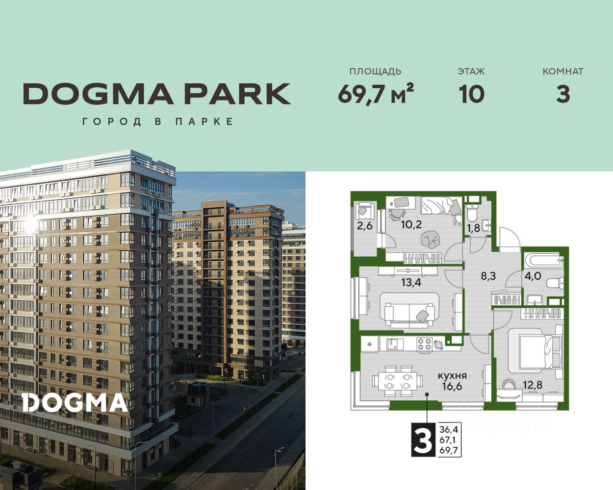 В продаже 3-комнатная квартира от застройщика! Мкр. "DOGMA PARK" г. Краснодар, Литер 18 Срок сдачи: 4 кв. 2027, общей площадью 69.7 кв.м., на 10 этаже.