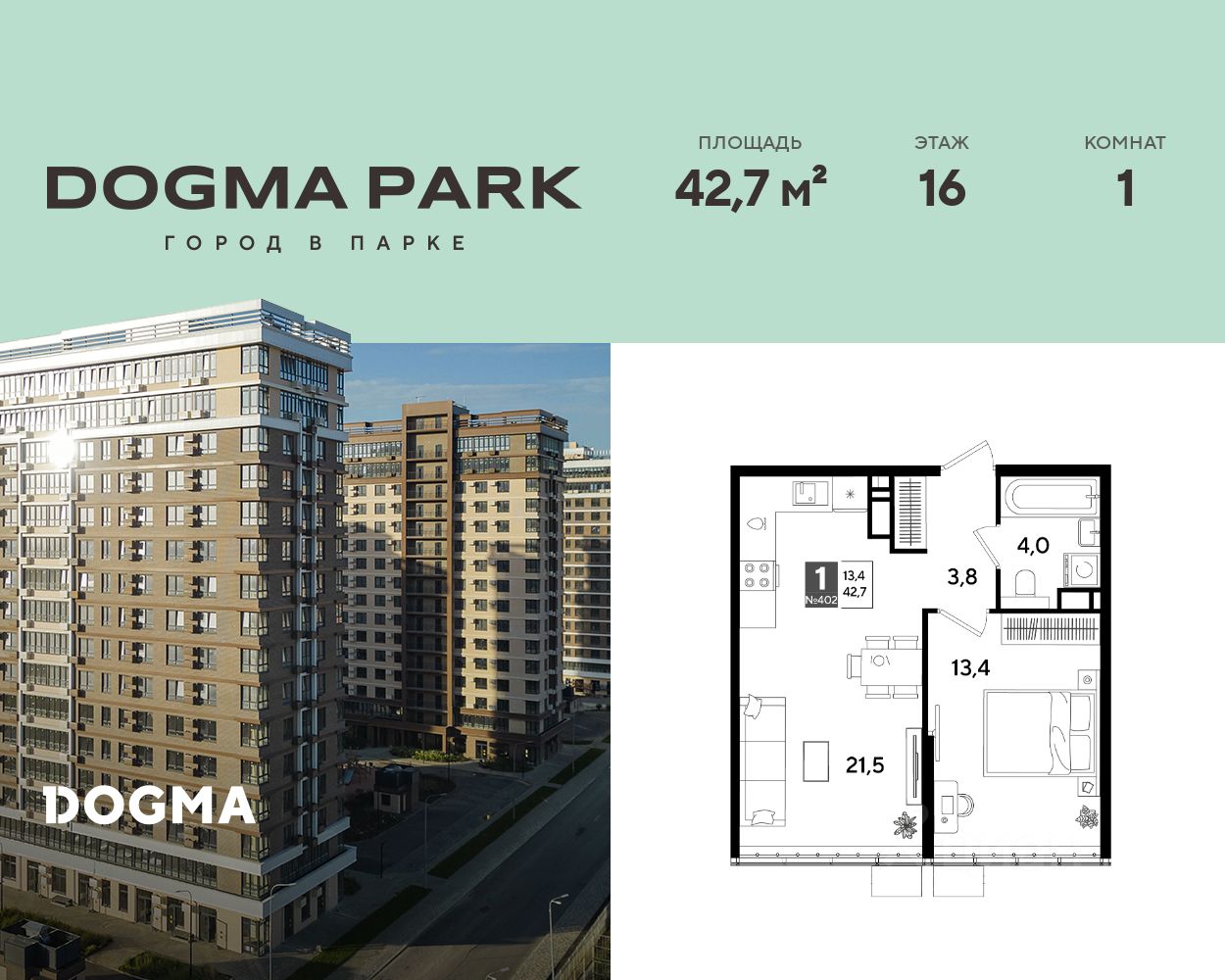 В продаже 1-комнатная квартира от застройщика! Мкр. "DOGMA PARK" г. Краснодар, Литер 18 Срок сдачи: 4 кв. 2027, общей площадью 42.7 кв.м., на 16 этаже.