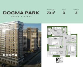 В продаже 3-комнатная квартира от застройщика! Мкр. "DOGMA PARK" г. Краснодар, Литер 18 Срок сдачи: 4 кв. 2027, общей площадью 70 кв.м., на 3 этаже.