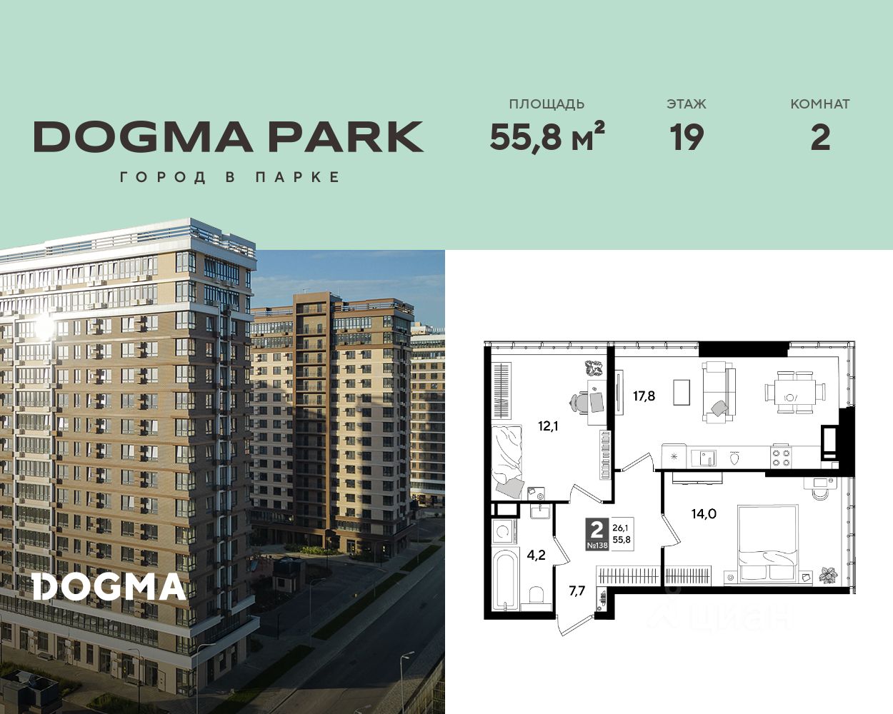 В продаже 2-комнатная квартира от застройщика! Мкр. "DOGMA PARK" г. Краснодар, Литер 20 Срок сдачи: 4 кв. 2027, общей площадью 55.8 кв.м., на 19 этаже.