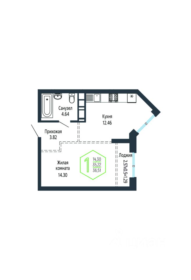Квартира свободной планировки, 36,62 м²