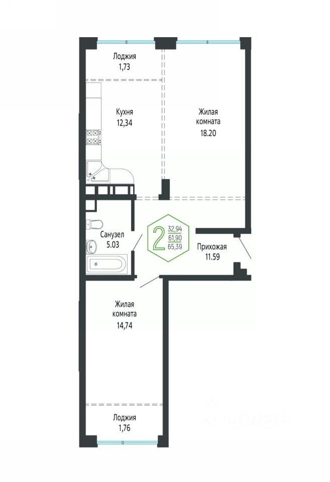 Квартира свободной планировки, 65,76 м²