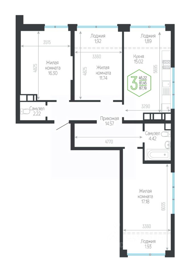 Общая площадь87,19 м²