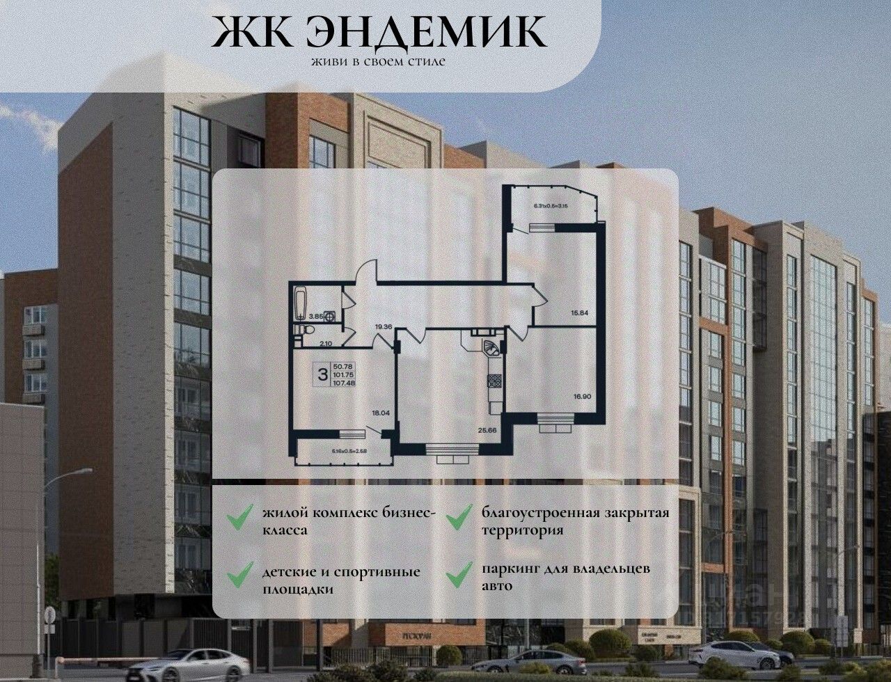Эндемик представляет собой дом бизнес-класса переменной этажности 10-12 этажей из 4-х подъездов и примыкающего многофункционального коммерческого здания. В основе проектирования жилых пространств вдохновляющий простор. В доме Эндемик представлены различные варианты квартир от студий площадью 49 кв. м. до трехкомнатных площадью 106 кв. м. Отделка предчистовая с улучшенной штукатуркой стен. Благоустройство закрытой территории включает в себя детскую площадку из эко материалов, площадки для футбола, баскетбола и воркаута, места для спокойного отдыха, редкие виды растений и деревьев, ландшафтное озеленение "4 сезона". Круглосуточное видеонаблюдение ведется на паркинге, внешней и внутренней территории дома. В шаговой доступности бульвары и парки, кафе и рестораны, торговые и фитнес-центры, 2 детских сада и 3 гимназии, улица Красная. Дом Эндемик имеет прямой выезд к основным транспортным артериям: улицам Дзержинского, Тургенева и Ростовскому шоссе.