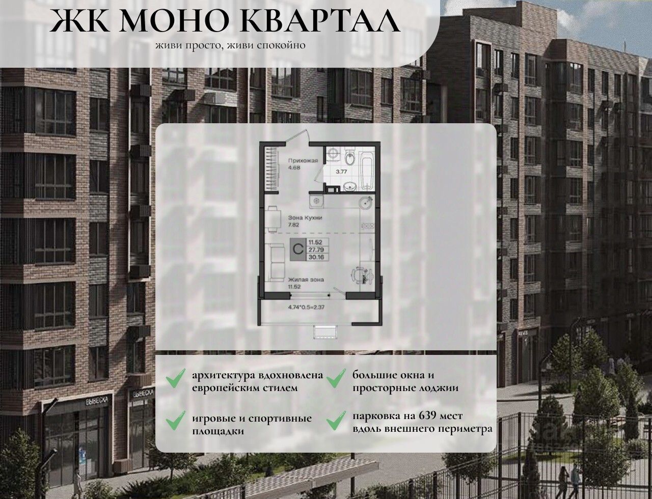 В комплексе представлено множество эргономичных планировок для студий и квартир с 13 спальнями. Квартиры идут в подчистовой отделке, с потолками высотой 2,75 метра, большими окнами и просторными лоджиями.